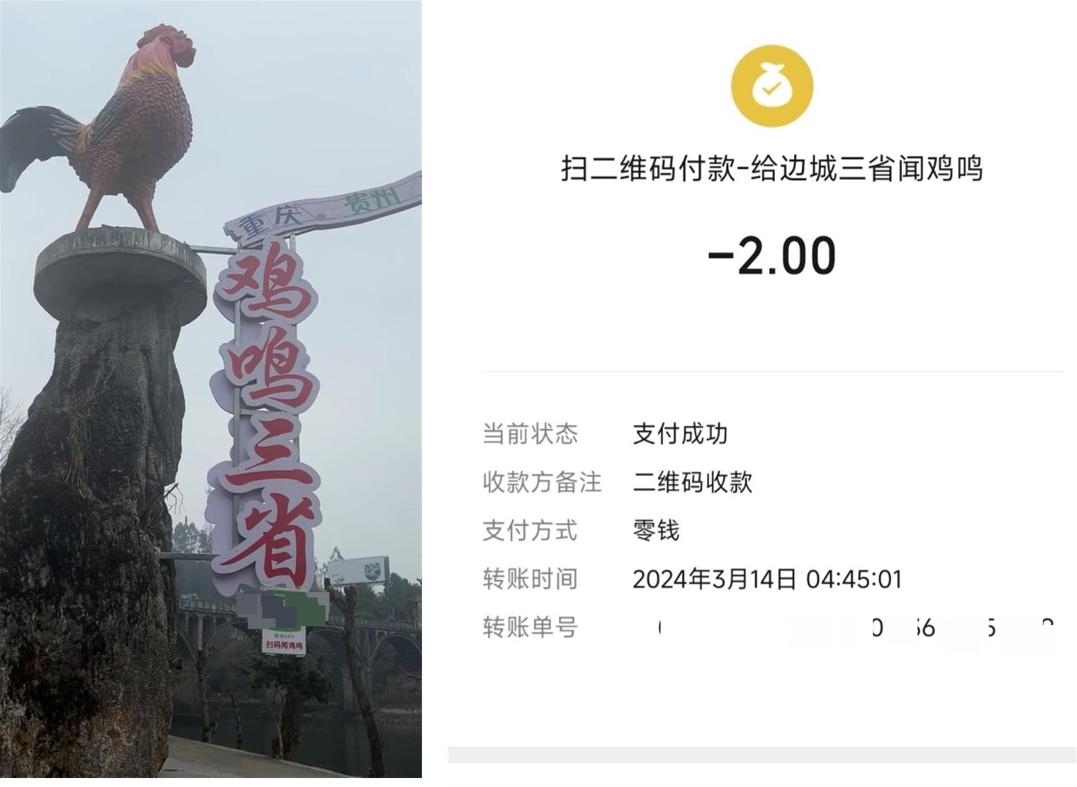 最近網(wǎng)上有個(gè)娛樂(lè)事件:在重慶、貴州、湖南三地交界的邊城,一農(nóng)家樂(lè)門(mén)口安放了一只公雞雕塑,并懸掛二維碼,游客掃碼支付二元后...